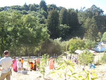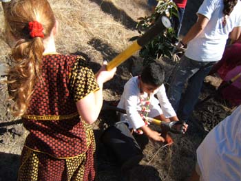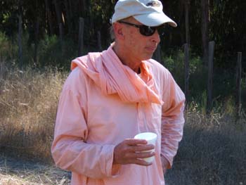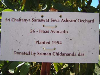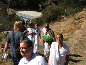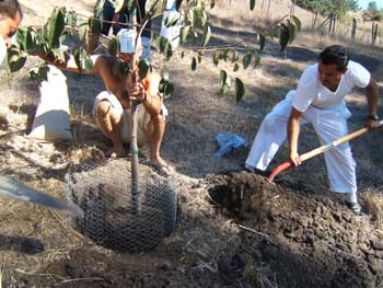 Ramanuga Prabhu from Tijuana replanted the trees. Other devotees carried buckets of water and put the barbed wire around the roots to prevent naughty gofers from eating them.