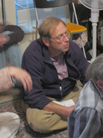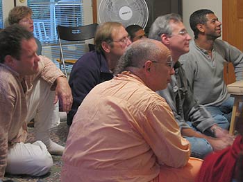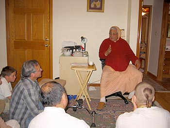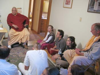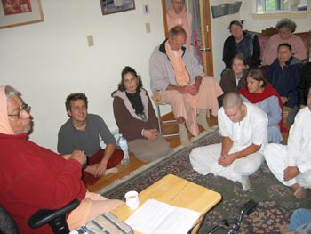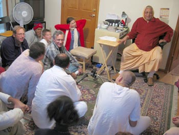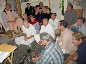 Hasyapriya Prabhu (center foreground), who is one of the pillars at the Soquel Seva Ashram, along with Sripad Siddhanti Maharaj and other devotees.