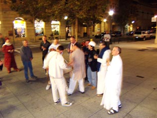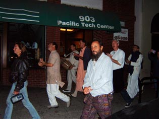 The sankirtan party gathers and walks down Pacific Avenue, the main downtown street.
