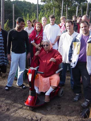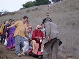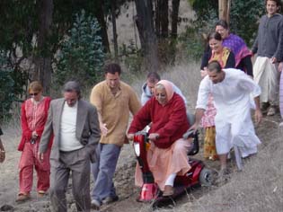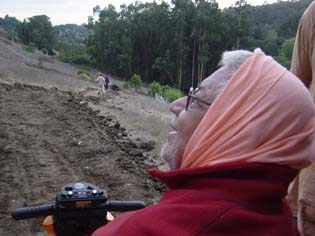 Every morning, Srila Gurudev looks out his window, and if the weather is nice, he will go out for a ride on his Scooter. Recently, he said that he wanted a road to the top of the mountain so he could see the ocean. So Hasyapriya Prabhu organized a crew to build a road that snakes up the side of the hill. |