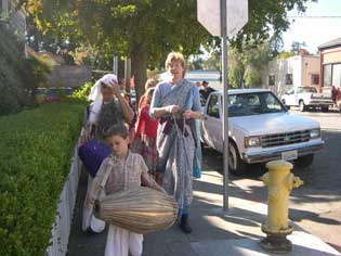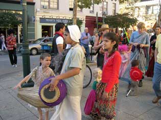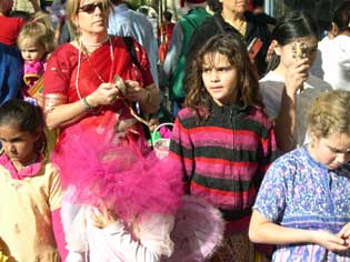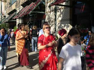 Syama Das and Premananda Das played mrdangas and led the group through the crowds of trick-or-treaters on Pacific Avenue.