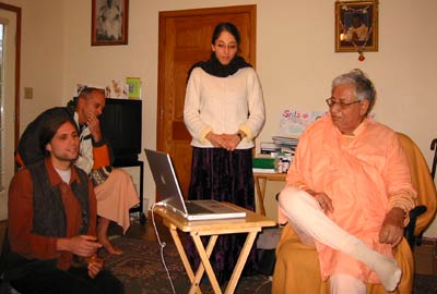 | Srila Gurudev listening to the audio offerings made from a few sannyasis, senior devotees, and pilgrims in India as a pilot project. Next year may include more.