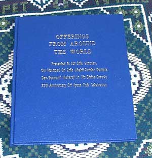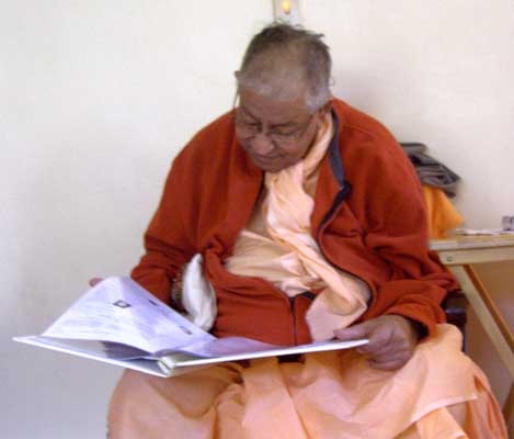 | His Divine Grace looking at the second volume of the Vyasa Puja book. |