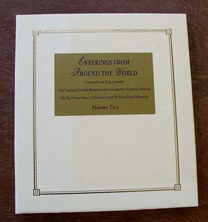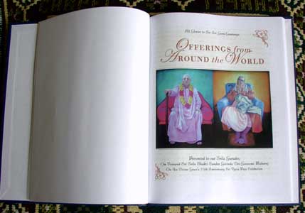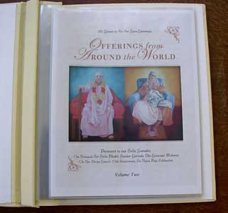 | Murali Mohan Prabhu and Vrndavanesvari Didi presenting the Vyasa Puja offerings to Srila Gurudev, in both audio and book form. For all the devotees who submitted offerings, His Divine Grace said the compilation was a "very special gift." |